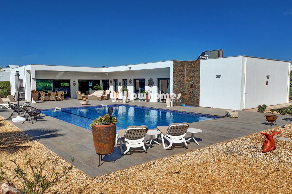 ---- EXCLUSIVE LISTING ----- This exquisite single-story, detached property is peacefully located on a good size plot, within a well-presented urbanization only 10 minutes drive from Olhão. This contemporary home, with private pool and garage, seamlessly combines modern design with timeless elegance is now for sale including the expansive 1,500 m2 landscaped plot. Upon entering, you are greeted by an inviting entrance hall with a guest bathroom, leading into a spacious, light-filled living room with an integrated dining area. The open-plan kitchen is fully equipped with high-end appliances and a separate laundry room for added convenience. A hallway leads to three well designed bedrooms, each offering en-suite bathrooms, including a luxurious master suite with a walk-in wardrobe. The living spaces, including the kitchen and bedrooms, open directly onto a large south-facing semi-covered terrace. This outdoor area is perfect for entertaining, featuring a dining area, a BBQ, and relaxing views of the low-maintenance, automatically irrigated garden. Surrounding the 7x11m heated saltwater pool, the sun-drenched terraces provide ample space for lounging, while an outdoor shower completes this idyllic setting. The property also includes a spacious garage with an electric door, providing secure parking and generous storage. Maintained in excellent condition, the villa boasts state-of-the-art amenities, including underfloor heating powered by hot water, central air conditioning, sophisticated lighting, Satellite TV and an advanced alarm system. Additional highlights include double-glazed windows, fitted wardrobes, automatic roller shutters, fibre-optic internet, and solar panels coupled with a heat pump for domestic hot water. Offered partly furnished, this villa is ready for you to move in and enjoy. This beautiful villa offers a unique opportunity to own a contemporary luxury home with comfort and class. Energy certificate class A.