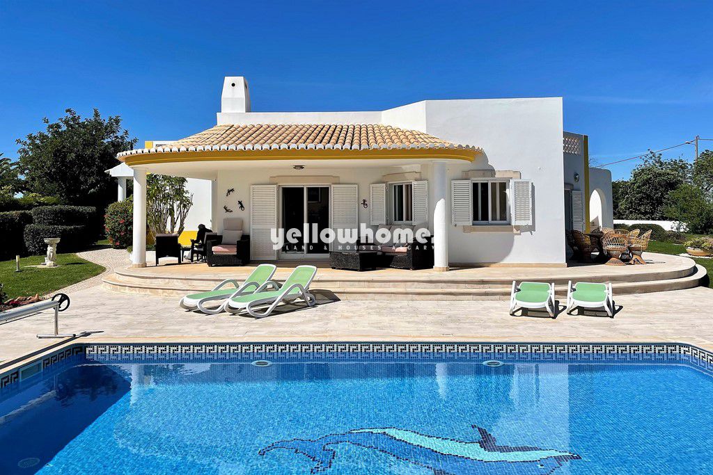 Excellent opportunity to purchase an immaculate bungalow style, fully furnished property in the Algarve, close to Albufeira, and conveniently located in a popular urbanisation within walking distance from several facilities like Restaurants, bar, shop, mini golf, playground, 4 common pools and a gym with Sauna. The centre of Albufeira with all its amenities and the sandy beaches is only a short drive away. The villa stands on a good-sized fully landscaped and irrigated plot in a quiet cul-de-sac. Easy access by tarmac road, from electric gates a cobblestone driveway leads directly to the carport or closed garage in front of the house. The villa consists of an entrance area with cloak room leading to the very bright and spacious living- dining room with wood burner stove and a brand new fully furnished and fitted kitchen with breakfast bar and a separate exit. Here patio doors opening up to the partly covered terrace and pool area. All 4 bedrooms and 3 bathrooms (2x en-suite) are located in one wing of the house, separated from the living area by a large glass door. All these rooms lead off a hallway and enjoy fitted wardrobes, air conditioning, electric wall heaters and access to the garden. An external staircase leads to the very large roof terrace offering lovely views of the surroundings and even partly to the sea. The heated pool is very private and is surrounded by extensive terraces, a large heated Jacuzzi and the beautiful landscaped garden with fish pond. The entire property is finished to a very high standard. Apart from 3 stairs leading down to the living room (ramp possible), this appealing villa is wheel chair friendly. Viewing is a must. Fully furnished!