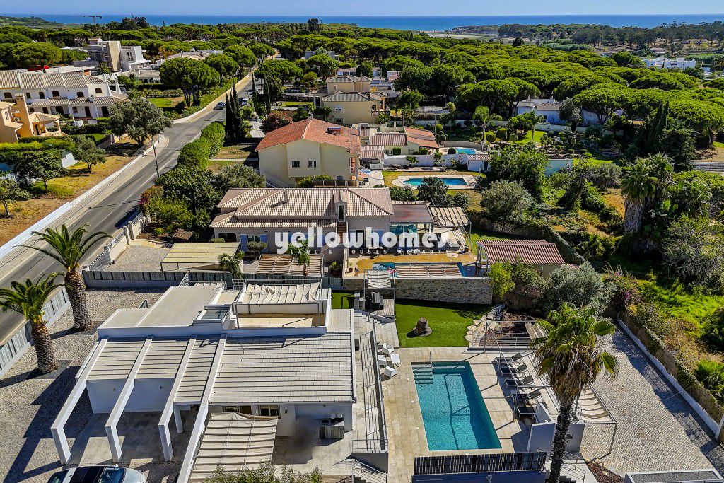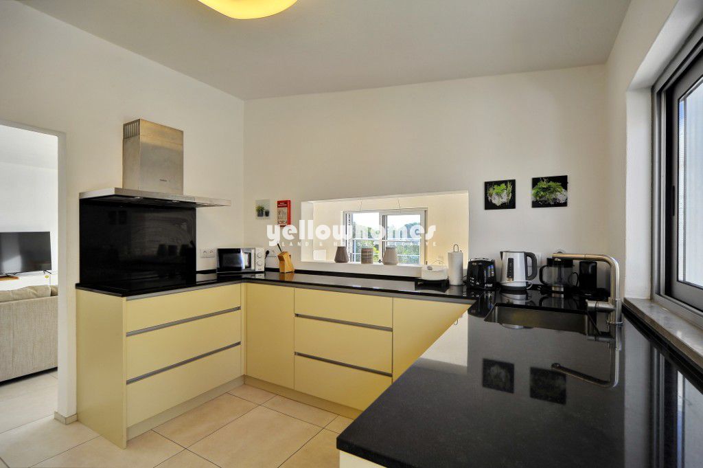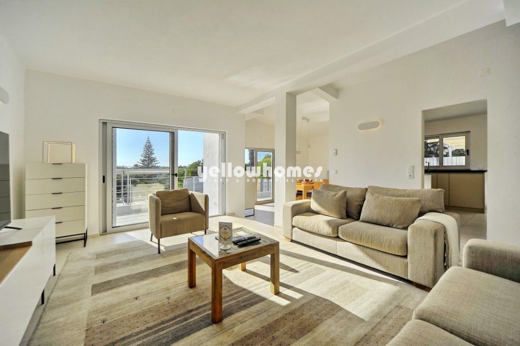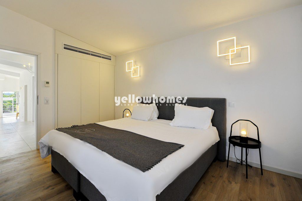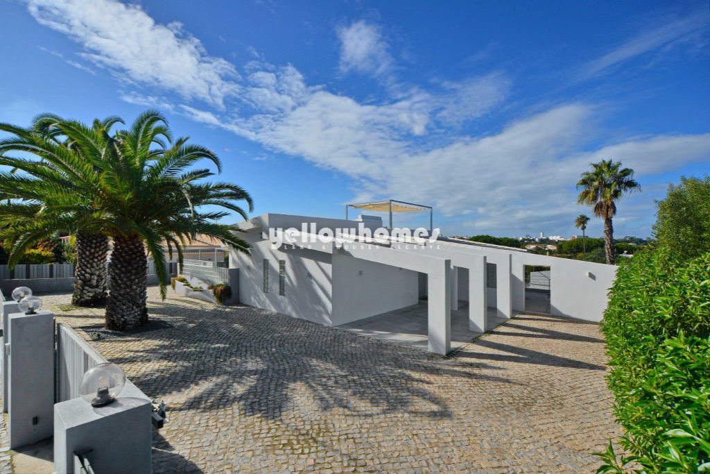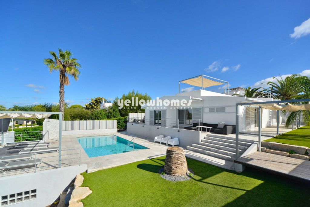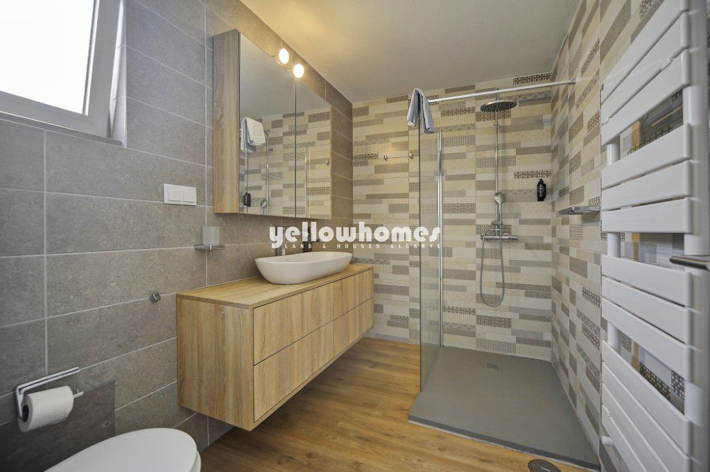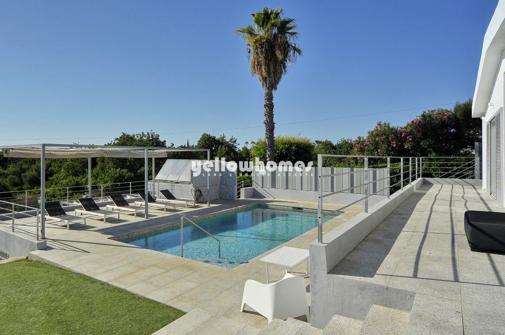 This top quality single storey property with 3+1 bedrooms is fully furnished for sale and is conveniently located in the central Algarve within walking distance to beaches and amenities in a green urbanization, offering everything you need. Through electric gates a cobble stone area offers ample parking space. Once in the house, a beautiful skylight brightens up the entrance hall with cloak room giving access to all 3 bedrooms, each featuring a modern and fully fitted en-suite bathroom, AirCo and fitted wardrobes/ dressing room. All bedrooms enjoy access to the surrounding terraces and garden. The good size modern kitchen is fully fitted and equipped and benefits from granite worktops, a separate exit and a breakfast area. The bright and open plan living- dining room impresses with large windows opening up to the generous terraces and pool area. A summer kitchen with BBQ and a cosy seating area, perfect for al-fresco dining, invites to spend long evenings with family and friends. The extensive south- west facing terraces with the large private pool are made to enjoy the sun until the evening. On the lower level of the plot a studio apartment offers additional accommodation for guests, and is composed by a combined living- sleeping room, a fully fitted and equipped modern kitchenette with breakfast table, a modern bathroom and private sun terrace with pergola. Here a technique room also hosts the washing machine etc. Enjoy beautiful views of the surroundings from the roof terrace or walk to the near beach or a restaurant, this unique quality villa with an easy to maintain garden is a rare opportunity to purchase a property close to everything. Newly furnished for sale! Contact us! Energy certificate class A.