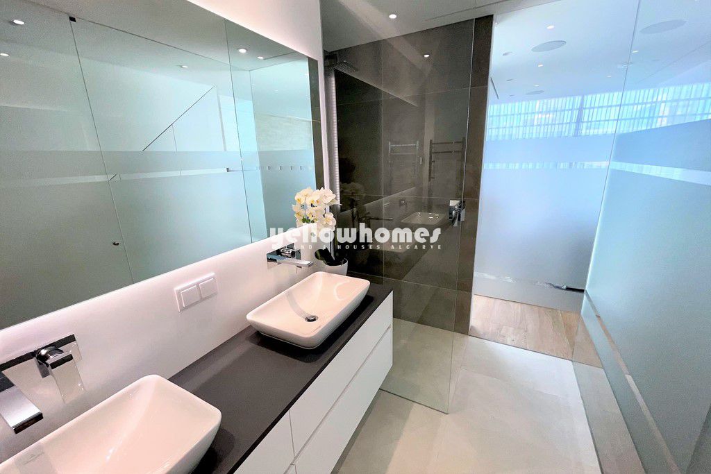 These brand new, linked and contemporary 3 bedroom properties are for sale and set in a small development in the Algarve just a short drive away from Almancil, beaches and the luxurious resorts of Vale do Lobo and Quinta do Lago. Each of the only 14 villas is designed in a unique contemporary style and consisting of 3-bedrooms, each with a private swimming pool, and spread over three floors. The property impresses with high quality finishings throughout and appeals with bright and functional open plan spaces. The ground floor consists of an entrance hall, a cloak room, a large living-dining room with fireplace and direct access to the terrace and the private swimming pool. The open plan, modern kitchen is fully fitted and equipped with top brands and offers a breakfast area. The first floor is composed of 3 modern double bedrooms, all with fitted wardrobes, and en-suite bathrooms. Large windows offer lots of light throughout the whole house. The spacious and private roof terrace offers great far reaching views and sunshine during the whole day. The property is equipped with underfloor heating, a central air conditioning system, solar panels for hot water, double glazing and much more. There is direct access to a large basement, featuring a window towards the pool, and to the underground parking with 2 parking spaces (included in the sales price). This property is perfectly suitable for permanent living or as a holiday residence being close to all amenities and wonderful beaches. If you would like to own a house which was designed by an awarded architect who has been listed as one of the top 10 architects internationally by the Homes Overseas Magazine for innovative designs, then this property might be the right for you! The Resort is planned to be finished By April 2021. Please contact us for more details and availability.