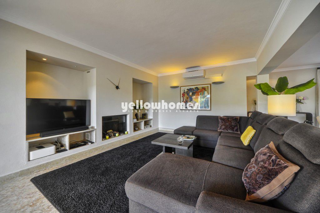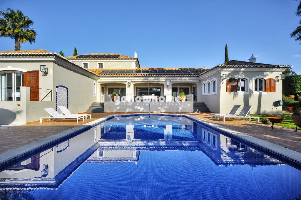 Located in the prestigious Vila Sol Golf Resort- Loule, this elegant detached villa enjoys a prime frontline position overlooking the golf course. Built in 2004, the property is now for sale with Yellow Homes and was designed with great attention to comfort and generous living spaces, offering a unique living environment in one of the Algarve’s most desirable residential areas. The generous interior features bright and spacious living areas, including a comfortable lounge with fireplace, a dining room and a separate office, all enjoying lovely views of the landscaped garden and swimming pool. The fully equipped kitchen offers ample storage and space for daily meals, making it ideal for both family living and entertaining guests. The bedroom area is thoughtfully separated from the main living spaces for added privacy. On the ground floor there are three spacious bedrooms, including one en-suite, as well as an additional bathroom. All bedrooms offer generous wardrobes. This level also includes a laundry room, a guest toilet and a large garage for several cars, complemented by an exterior carport. Upstairs, two further en-suite bedrooms provide comfort and privacy, while the open-plan lower level offers versatile space that can be used as a games room, home cinema or additional storage. The villa also features a large covered terrace facing the golf course, providing a pleasant outdoor seating area that can be enjoyed even during the milder winter months. The property is equipped with underfloor heating, air conditioning, solar panels, electric gates and an alarm system. It is sold fully furnished and equipped and is presented in excellent condition. Outside, the beautifully landscaped garden with palm and tropical trees ensures complete privacy. A handcrafted thatched-roof pavilion provides the perfect setting for al-fresco dining and family gatherings, while the swimming pool enjoys excellent sun exposure and protection from the wind, allowing for year-round enjoyment. Ideally located for golf enthusiasts, the renowned Vila Sol Golf Course is just minutes away, while the beaches and the vibrant Vilamoura Marina, with its restaurants and boutiques, can be reached within a 10-minute drive.