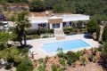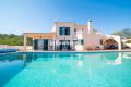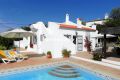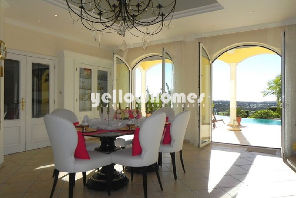 This immaculate 4 / 5 bedroom villa with stunning country and sea views and located just above Vilamoura has been built to the very highest specifications. The villa sits behind a fully fenced and secure plot of 2.900 m2 and is built over 3 levels with stairs and an elevator that access all levels of the property. The ground floor consists of high quality spacious fitted kitchen ideal for entertaining, a living room with separate dining area both of which overlook the pool and gardens, an en suite bedroom , an office, a sauna and bathroom and a guest apartment with living room, office, preinstalled kitchen, bedroom and bathroom. The first floor has two stunning south facing bedrooms, both en suite and both with access to the terrace. The private roof terrace is accessed via the master bathrooms patio windows. The basement offers a preinstalled cinema room that is currently being used as an entertainment area with bar, a bathroom, a double garage, a laundry room and plenty of storage. Externally the property boasts an infinity saltwater pool with water fall, assorted and numerous fruit trees in a beautifully landscaped garden, and a 15m2 wooden house with electricity and a 5th bedroom. This is a magnificent property that needs to be viewed in order to appreciate the full list of quality specifications.