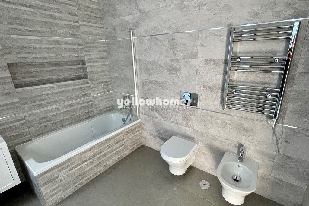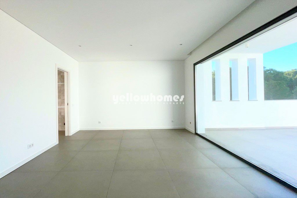 Excellent villa of contemporary architecture covers around 350 m2 with high quality construction and plenty of natural light due to the windows and generous terraces that allow you to enjoy magnificent views over the golf course and the pine forest. The villa will be built with a very high thermal insulation, which results in the highest energy rating possible. The ground floor level comprises 2 en suite bedrooms, a hall with a floating staircase, a dining and living area in open plan style and a spacious kitchen ( and storage room) facing the barbecue area, the pool and overlooking the garden and the golf course. The first floor comprises 2 further en suite bedrooms both with terraces. The whole villa is equipped with under floor heating, air conditioning, heating through solar panels. The swimming pool surrounded by deck, has pre-installation for water heating and pool cover whilst the garden has automatic irrigation. The plot will be fenced in the front by a wall and automatic sliding gate for the cars and a pedestrian door. The 2 sides of the plot will be fenced by a metallic fence covered by green hedges. The rear of the plot facing the golf course will be open ensuring stunning views of the golf course. Situated in a well-established, peaceful resort with 27 golf holes and only a few kms from the beaches and from the Marina of Vilamoura. The villa is currently under construction and is planned to be finished by summer of 2021. Finishings: floor tiles in stone/ceramic, thermal aluminium including double glazing, automatic security shutters, air conditioning, solar panels hot water, video intercom, automatic garden irrigation, integrated lighting and false ceiling throughout the house, tv, telephone and internet connections in each bedroom and in the living room and kitchen. Gas connections: in the kitchen, fireplace (living room) and the barbecue area (outside terrace).